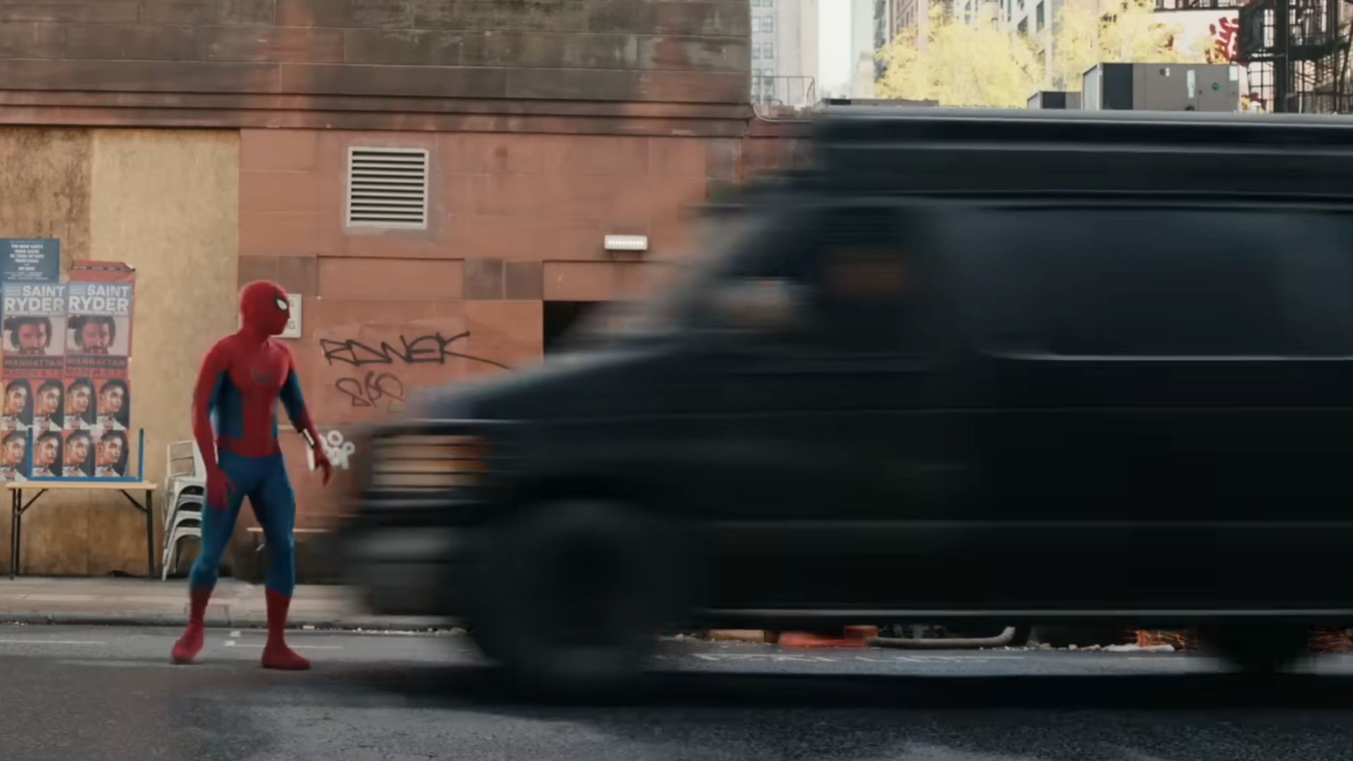スパイダーマン: ブランニュー デイ トレーラーのテンポの速い瞬間では、スパイダーマンが装甲車を追いかけてニューヨーク市を走っているところ、突然パニッシャーのバンに側面から攻撃される様子が描かれています。