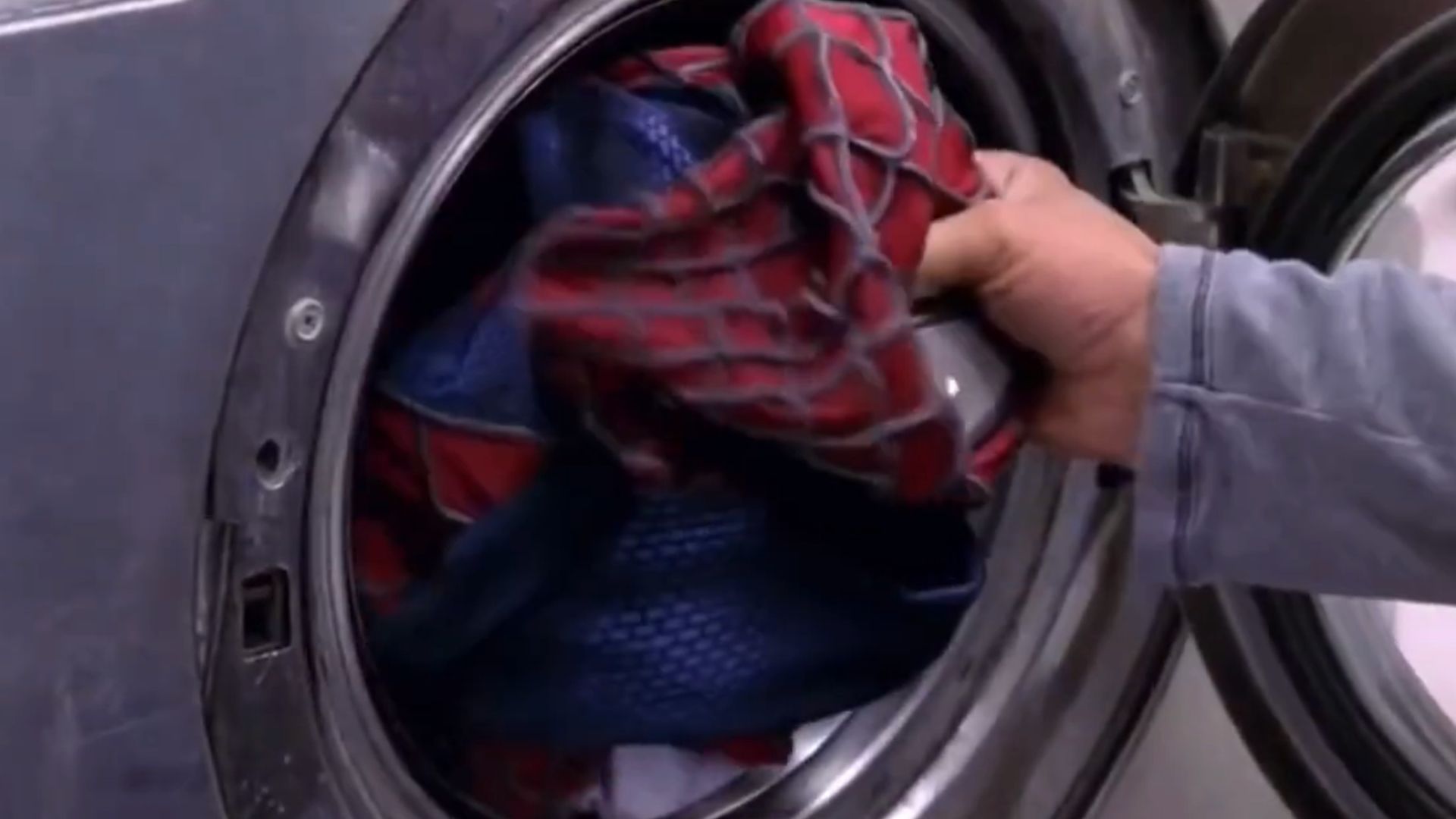 サム・ライミ監督のスパイダーマン 2 では、トビー・マグワイア演じるピーター・パーカーがスパイダーマンのスーツも含めて洗濯をします。彼は衣装を隠そうとしたが、誤って白い服と一緒に洗濯してしまい、下着と靴下が赤と青に変色した。