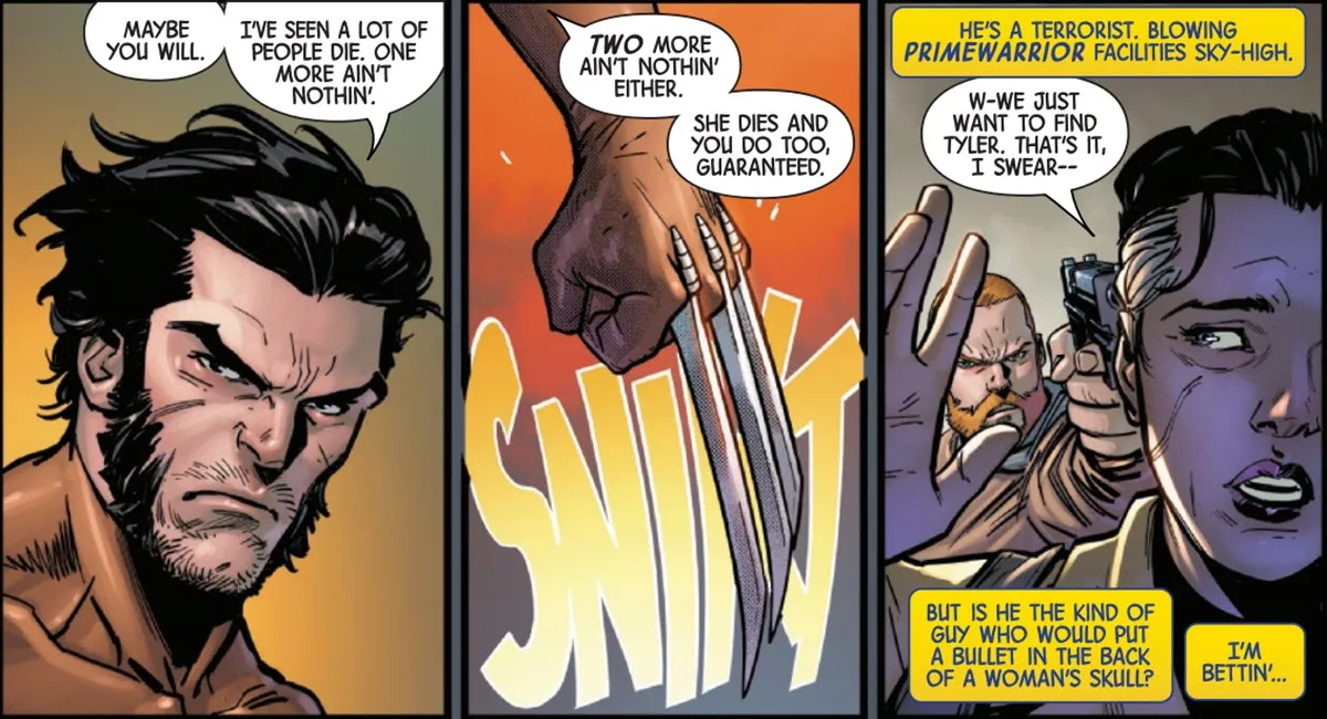 この物語は後に、服を盗もうとした際に彼を驚かせた警備員を楽々と制圧するタイラーの驚異的な強さを実証します。彼の力にもかかわらず、タイラーは戦いを終えることができず、代わりに恐怖のあまり逃げ出します。これは、彼がウルヴァリンのような熟練した戦闘機に対してあまり勝ち目がないことを意味します。