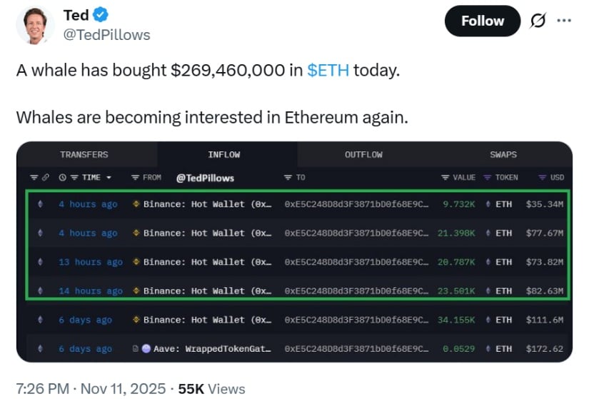 ああ、見てください!クジラは深く暗い海から現れました。オンチェーンデータによると、検証された一頭のクジラがわずか12時間で75,418 ETHに2億6,900万ドルを投じることを決定したことが明らかになりました。それは素晴らしい小さな変化です。つまり今、このクジラは合計 266,901 ETH、つまり 9 億 4,900 万ドル相当の資産を抱えて泳ぎ回っていることになります。並外れた市場アナリストであるテッド・ピローズ氏は、「クジラは再びイーサリアムに興味を持ち始めている」と同調する。まあ、それはただの桃ではありませんか?まるで私たちが知らないことを彼らは知っているかのようです。