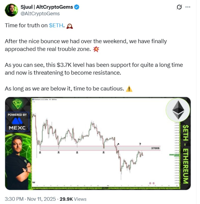ああ、でもどの物語にも悪役がいます。 3,700ドルでレジスタンスに入ります。 AltCryptoGems の Sjuul 氏は、これまで不運と憂鬱をもたらしてきた人物ですが、「この 3.7,000 ドルのレベルは長年にわたってサポートされてきましたが、今ではレジスタンスになる恐れがあります。」と指摘しています。それは、何年も付き合っているのに、突然パーティーで耐えられなくなる友人のようなものです。 Bitfinex ETH/USDT チャートは、10 月下旬以降、このレベルを突破しようとする複数の試みが失敗していることを示しています。イーサリアムが突破できなければ、その強気な展開に問題が生じる可能性がある。