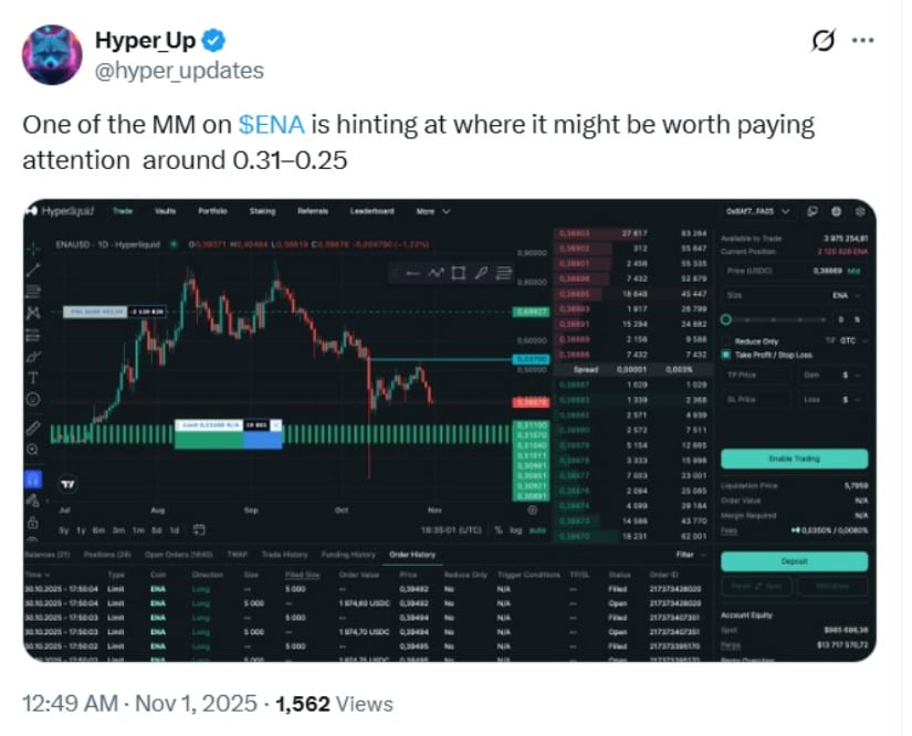 2025年11月1日の時点で、ENAは0.39ドル付近で取引されており、市場専門家が特定した主要なサポートゾーン付近で安定している。 「0.38ドルはイーテナの$ENA無期限契約への戦略的なエントリーポイントだ」と仮想通貨アナリストのアリ氏は述べ、さらなる下落のリスクと、買い圧力が続いた場合の上昇の可能性の両方を強調した。 🤷♂️💸