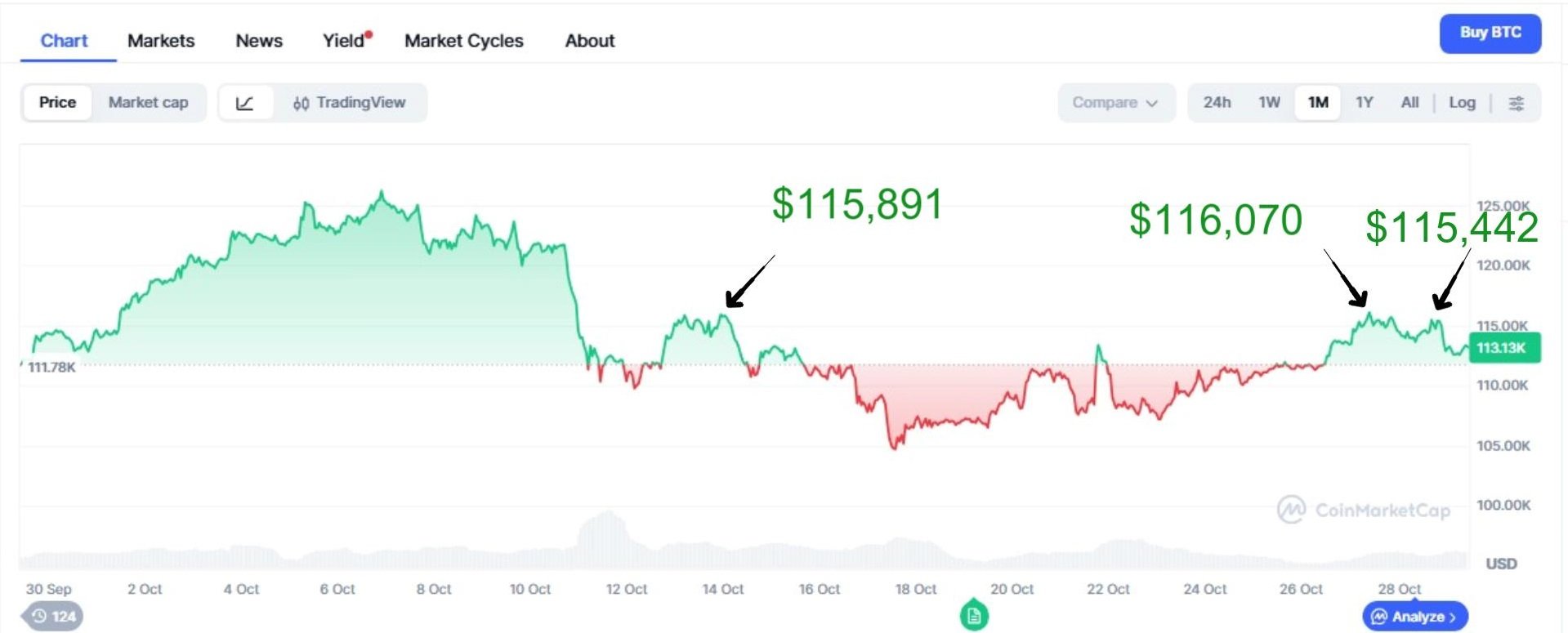 それ以来、$DOGE は失地を取り戻すことができませんでしたが、ビットコインも同様でした。 10月10日以来、BTCドルは3回11万5,000ドルを超えることができたが、毎回数時間以上勢いを維持できなかった。トランポリン上のダックスフントのように安定した暗号通貨ほど「回復」を示すものはないからです 🐕