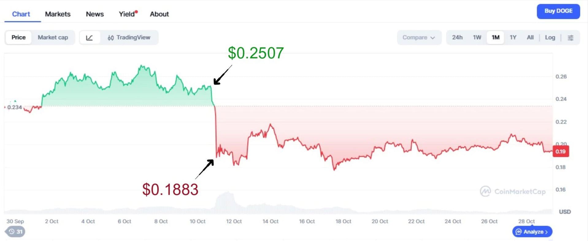 ビットコインとイーサリアムは数時間でそれぞれ11%と13%下落した。ドージコイン自体は10月10日の0.2507ドルから翌日には0.1883ドルまで暴落した。 24.8%の収縮。なぜなら、24.8% の下落ほど「市場の暴落」を示すものはないからですが、それでも猫のビデオへの感情的な投資よりはまだ小さいのです 🐱