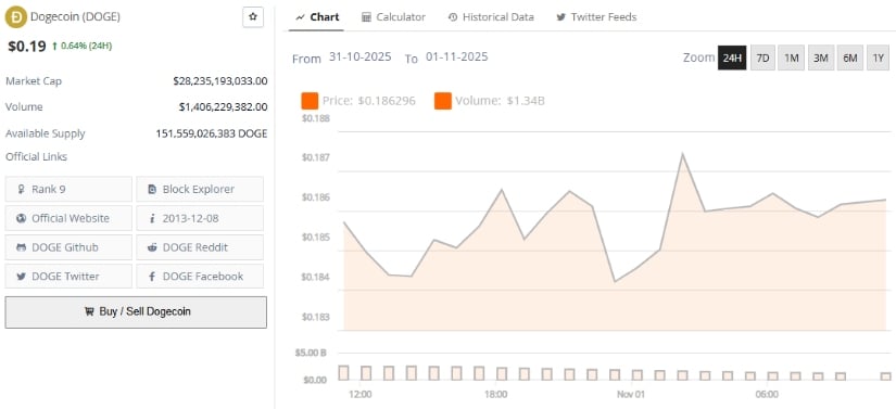 常にチャートの占い師である暗号アナリストのアリ(@ali_charts)は、「クジラの保有額と値動きとの相関関係は依然として信じられないほど緊密だ。0.18ドルはドージコインにとってのルビコンだ。それを保持すれば0.26ドルか0.33ドルへの道が手招きするが、それを失うと奈落の底が大きく開く。」と苦笑しながら観察している。この落書きの時点では、DOGE は 0.183 ドルで推移しており、嵐の庭園に咲くはかなげな花であり、その回復力は 2025 年 11 月 1 日の風によって試されています。