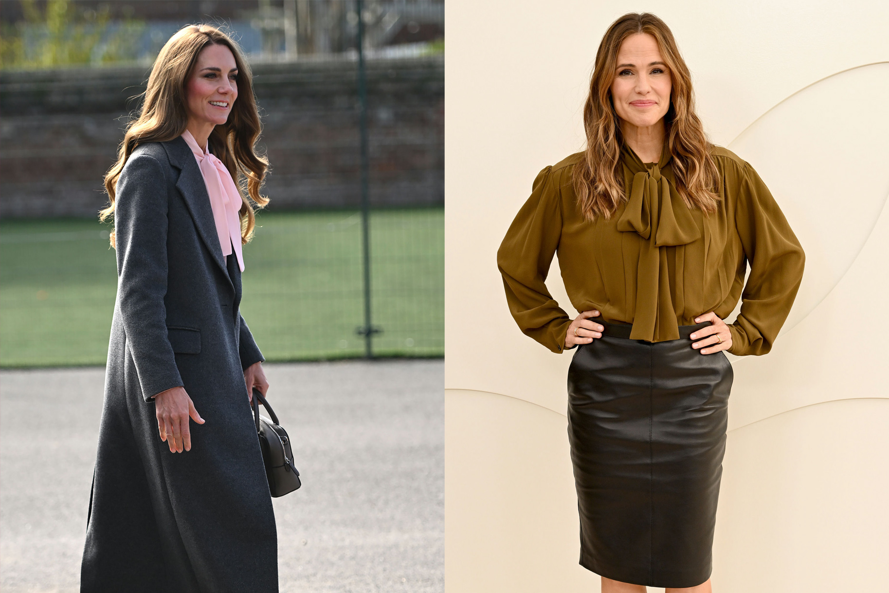 タイネックブラウスはシンプルなスタイリングが可能な万能アイテムで、単独でトップスとして着用したり、アクセサリーと組み合わせたりすることができます。キャサリン妃はパンツやフラットシューズと合わせて着用することが多く、仕事にもカジュアルな外出にも適した服装です。ジェニファー・ガーナーのように、ペンシルスカートでも同様の外観を実現できます。ミドルトンとガーナーはデザイナー ブランドを選ぶ傾向がありますが、私たちが選択したオプションは、さまざまな価格帯で同等のスタイルを提供します。