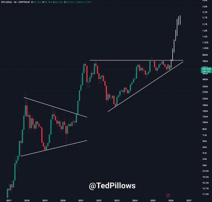 逆説を好むチャーティスト、TedPillows が BTC/金比率チャートを公開。 「米国政府機関の閉鎖が終われば、ビットコインは金を上回るパフォーマンスを発揮する可能性がある」と彼は思索する。リスクと安全の間、古い金の神と新しいコードの神の間での繊細なダンス。しかし、その古代の遺物である金は、貿易戦争とパニックに支えられて権力にしがみついています。しかし、常に楽観主義者のテッドは、揺れることに疲れた振り子のように、勢いがすぐに変化するかもしれないと示唆しています。 ⚖️