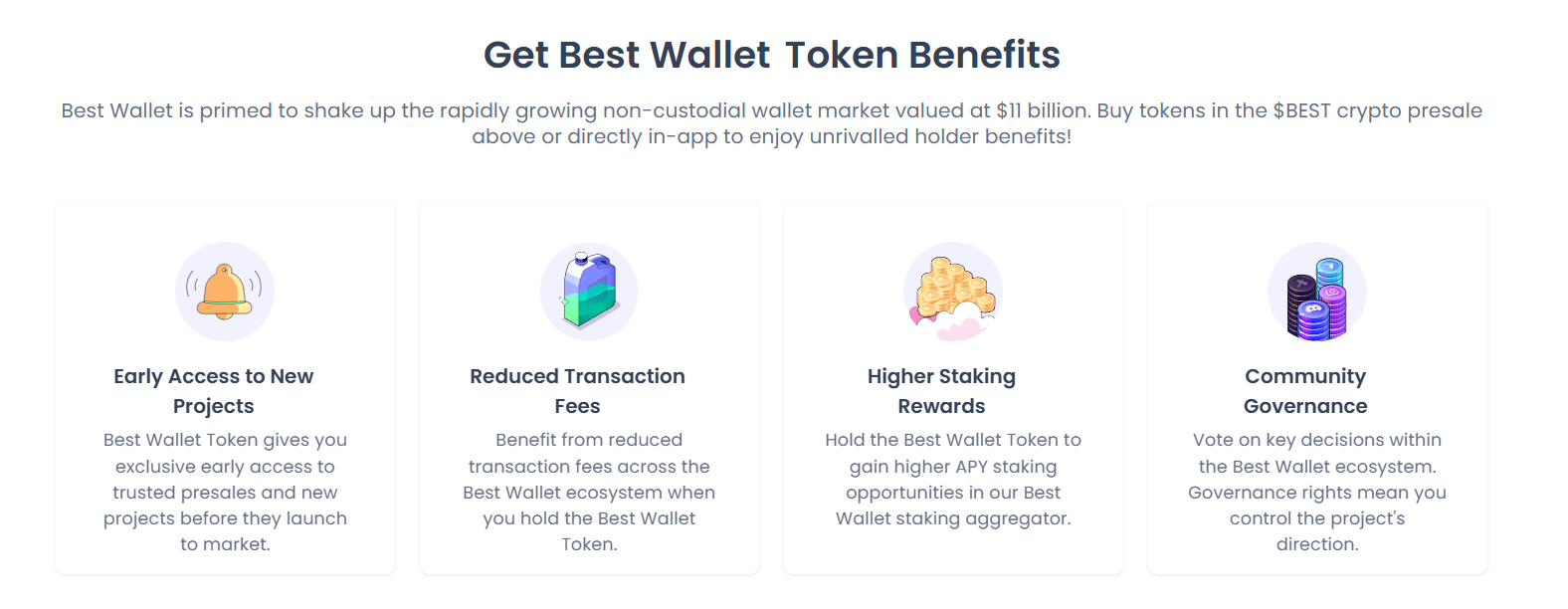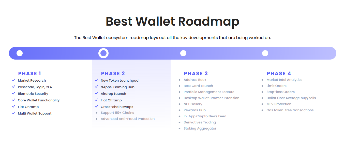このアーキテクチャの中心にはベスト ウォレット トークン ($BEST) があり、エコシステム内のあらゆるものに電力を供給します。 $BEST を保有すると、プレセール プロジェクトへの早期アクセス、手数料の削減、APY ステーキングの増加、ガバナンス権が得られます。それは王国への鍵だ! 🔑