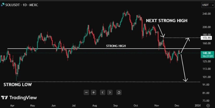 SOLは現在、より大きなマクロの方向性を決定することが多い構造的要点である以前の強高領域を再テストしている。ブローク・ドゥーマー氏は、「次の数本のローソク足が12月の上昇かさらなる下落を決定する可能性がある」と指摘している。 なんと詩的でしょう。 🕯️