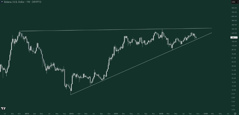 SOL チャートは現在幾何学的に恵まれた三角形に似ており、コイルばねのように抵抗付近で引き締められています。蓄積?はい。疲労感?早く売りすぎた人の財布の中だけ。親愛なる読者の皆さん、このパターンはグランドフィナーレ、つまり将来の収益によって資金提供される花火ショーへの前奏曲です。 🎆