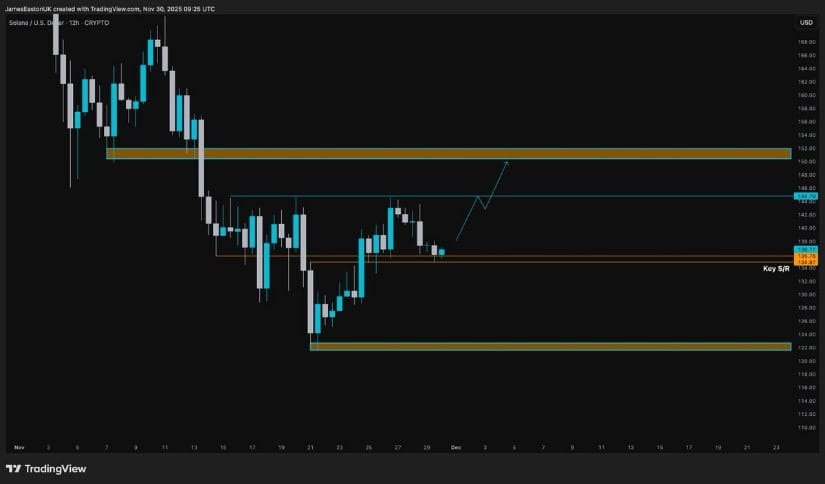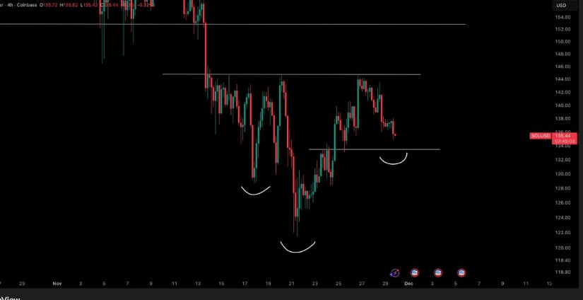 クリプトトニーを入力してください。彼は小さなパターンが形成されていることを発見しました。ソラナはサポートでベースを作ろうとしているが、132ドルが境界線だ。このレベルを克服できれば、145~150ドルの大きな抵抗の壁に向かって押し上げられることが予想される。問題は、そうなるのか、ならないのか、ということだ。 🧐