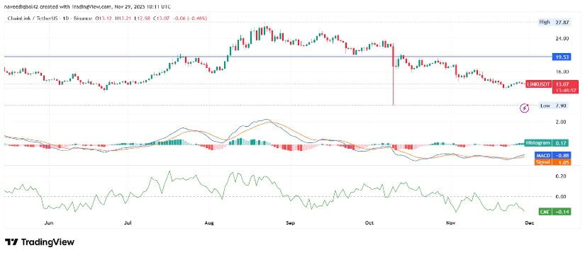 日足の時間枠では、LINK は 19.53 ドル付近のより高い時間枠のサポートを維持できなかった後、明らかな下降傾向を維持しており、現在は抵抗線に転じています。価格は現在13ドル付近で取引されており、27ドルから28ドルの領域から長期にわたる下落を経て安定している。次に確認されたサポートは7.90ドル付近にあり、売り圧力が再開した場合に注目すべき重要なレベルとなる。コインが15ドルから16ドルのゾーンを取り戻すまで、市場全体の構造は売り手に有利です。 📉