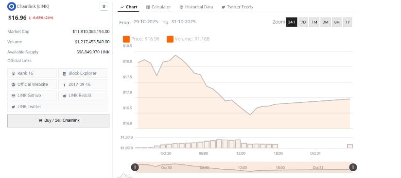 そして現在、ドラマは続いており、LINKは過去24時間で6.65%下落した後、わずか16.96ドルで取引されている。今週初めに同社は、18 ドルを超える水準を維持しようとなんと頑張ったのだが、残念ながらそうはならなかった。 1日の取引高は12億1000万ドルに減少し、時価総額は約118億1000万ドルとなった。悪くはないが、ランキングの最下位から抜け出すには確かに十分ではない。現在、暗号通貨エリートの中で16位の座を維持しています。