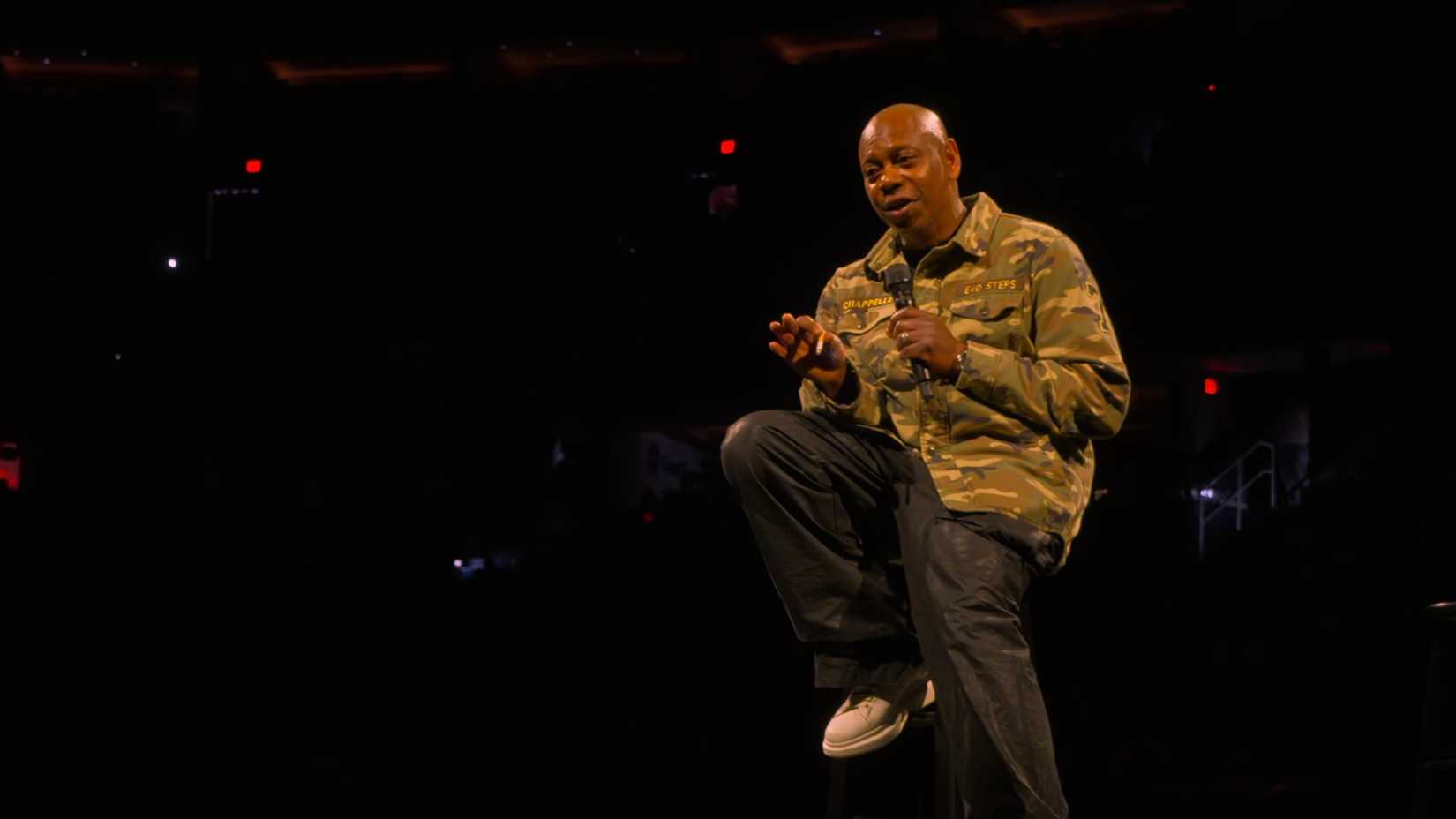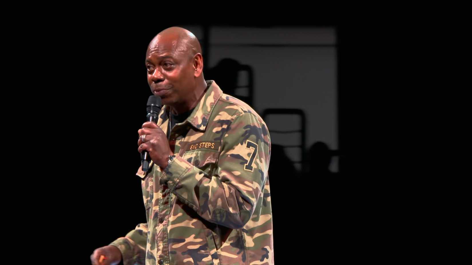 その後、ショーは 10 月にワシントン D.C. で撮影されたメイン パフォーマンスのハイライトに移りました。デイヴ・シャペルはユニークな迷彩柄のジャケットを着てステージに登場。背中にはコリン・キャパニックの名前と背番号7があり、ポケットにはシャペルの名前が縫い付けられていた。