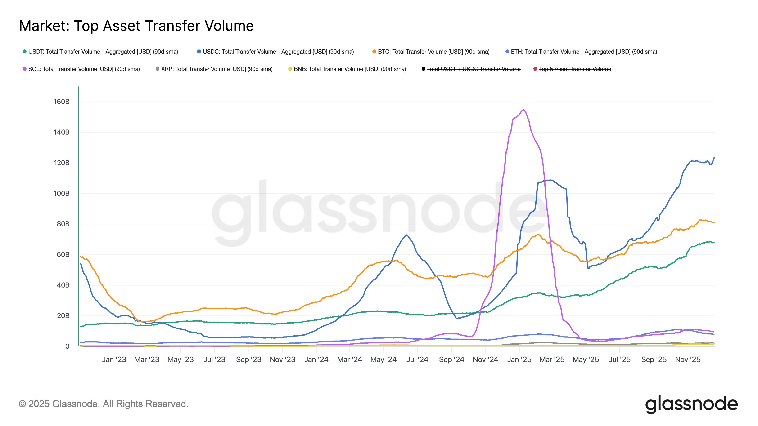 USDTとUSDCを合わせると毎日1,920億ドルが動きます。非ステーブルコインのトップ5は?わずか970億ドルだ。 「ステーブルコインは主要な流動性レールとなった」とグラスノードは自然法則を告げるかのように言う。 「一方、在来資産の移転は依然として比較的抑制されています。」丁寧な言い方: 「誰もあなたのコインを取引していません。彼らはドルを移動したいだけです。」 💔