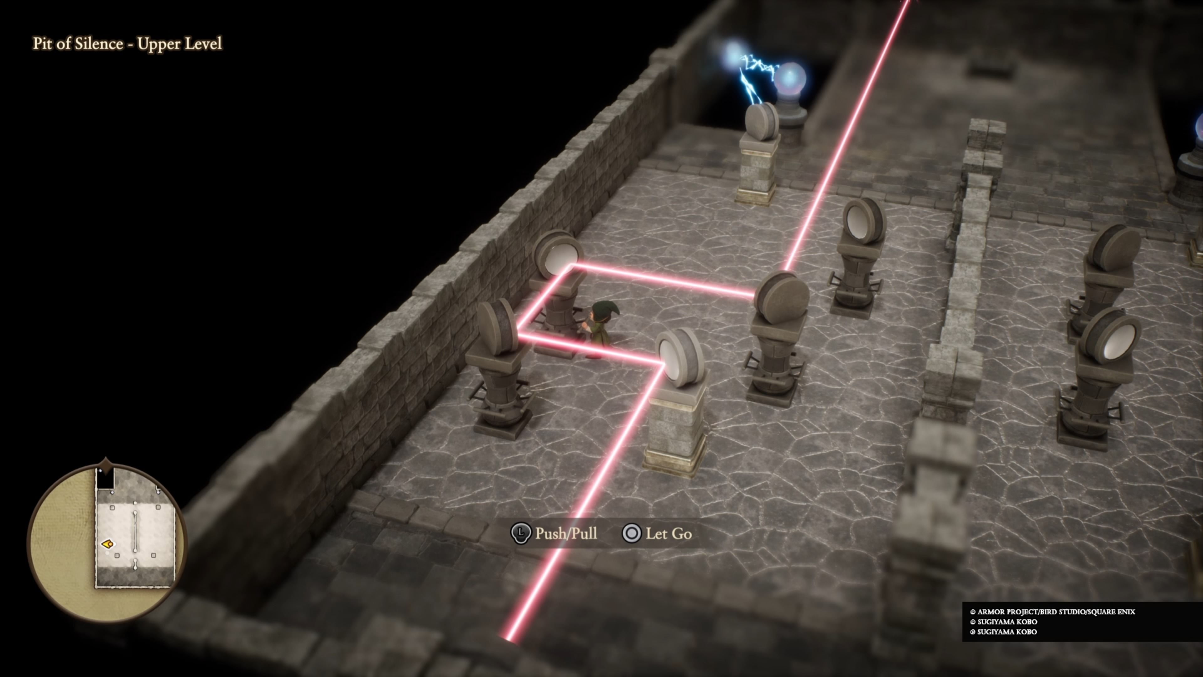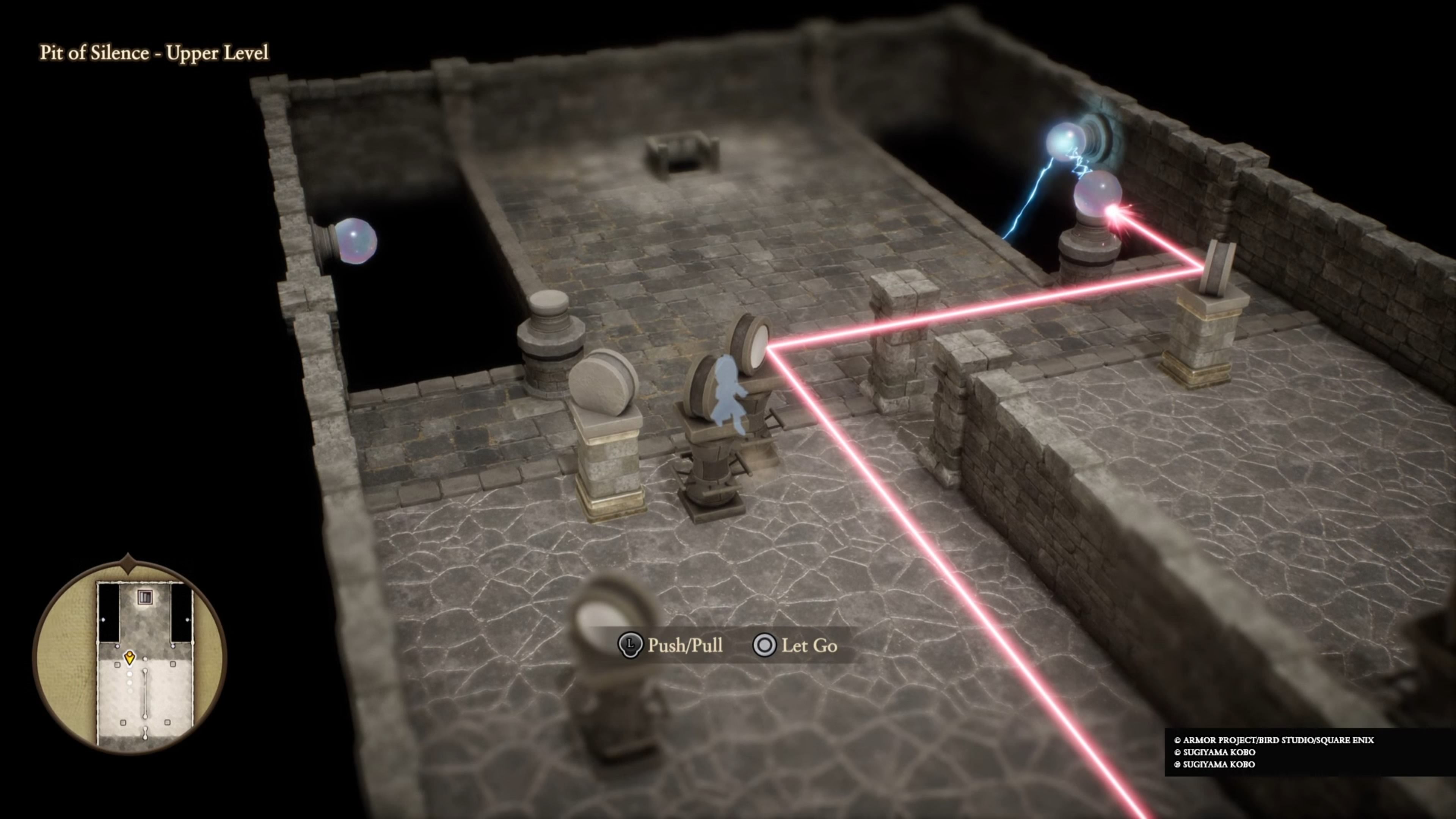 Pit of Silence ミラー パズルの最初の部分は非常に簡単です。部屋の左側にある鏡を上の画像のように配置して、光線を水晶玉に反射させるだけです。これによりクリスタルが壊れ、パズルの次の部分に進むことができます。