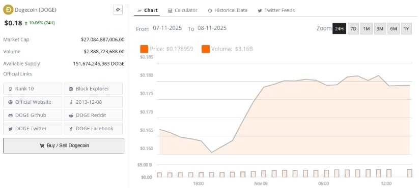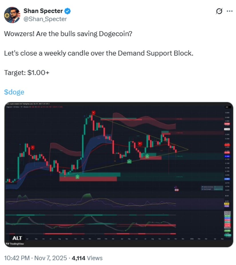 2025年11月7日、DOGEは11.66%上昇し、ほとんどの仮想通貨を上回るパフォーマンスを示しましたが、依然として2021年のピークを85%下回りました。スプレッドシートとカフェインで武装した投資家たちは、あたかも安値で買うことが助けを求めるのではなく戦略であるかのように、サポートゾーンの近くに「蓄積」している。 📊
