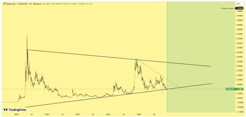 酔ったバレリーナのようにチャートが踊り、アナリストがなぞなぞを語る、薄暗い金融予言の回廊に、仮想通貨界の道化王子ドージコインが姿を現す。現在は0.15ドル付近で泣き叫んでいるが、0.80ドルという目もくらむような高みに向かうとささやかれている。ああ、輝かしい楽観主義ですね!パターン、三重の蓄積パターンは、あたかも宇宙自体が私たちの希望を笑いながら、DOGE が技術的なはしごを駆け上がるのを私たちが見るかもしれないことをほのめかしています – 単なるヒントです。 🎩✨