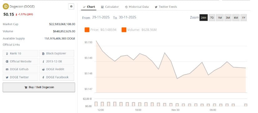 2025年11月末時点で、DOGEは0.15ドル付近で低迷しており、週ごとにささやかな上昇(+9%)がささやかれているが、月次および年間損失(-22%と-60%)に泣き叫んでいる。移動平均線、つまり古代の神託は弱気の歌を歌っており、サポートゾーンは0.145ドルから0.150ドルあたりです。レジスタンスバーは、悪い日のバーのように、0.154〜0.160ドルで待機しています。 🥀📉
