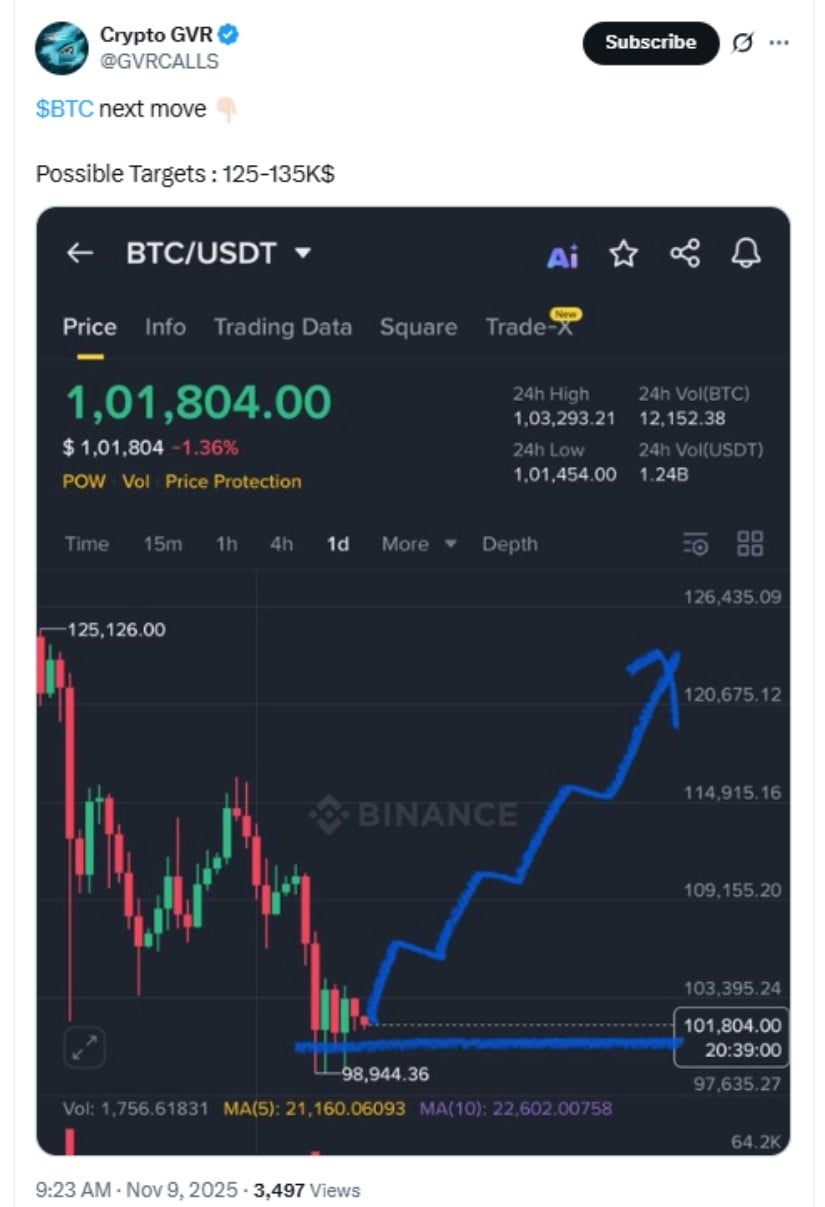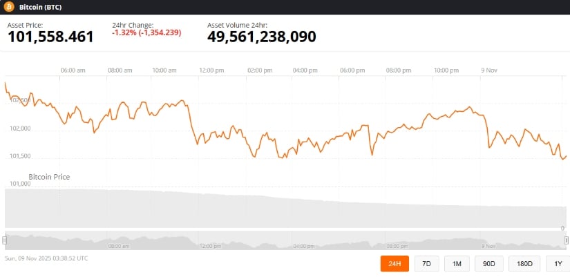 2025 年 11 月 9 日の時点で、この有名な BTC は 101,800 ドルで売られていますが、その価格は経験豊富なランボ所有者でさえ赤面するほどの高額です。この回復は、オスカー・ワイルド自身が真珠を握りしめたであろうほど劇的な変動の一週間を経てのことだった。 99,376ドルでちょっとした浮気?市場の道化師による単なるいたずらです。本当のオチは?大ハンマーのような繊細さを備えた雄牛が王座を取り戻しました。