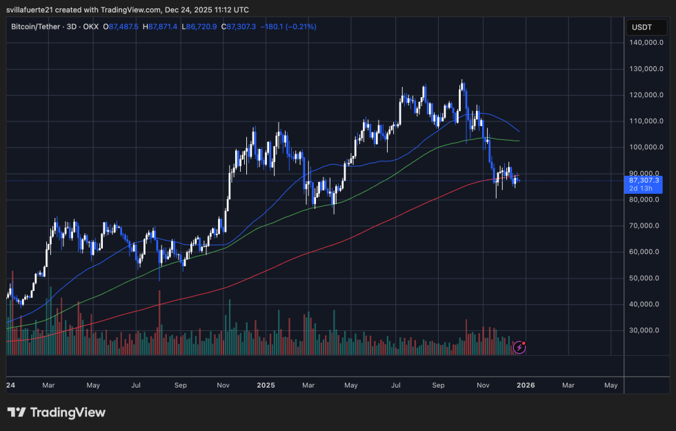 最新の悪ふざけを覗いてみると、ビットコインは3日チャートで87,300ドル付近を推移しており、120,000ドルから125,000ドルという目もくらむような高さからかなり急激な調整急落を経て堅調となっている。価格は依然として長期トレンドサポートを余裕で上回っているが、中期構造は苦悩の兆候を示しており、勢いに基づく拡大から、高値の下落とフォロースルーの明らかな欠如に彩られた調整段階に移行している。なんとも前向きで憂鬱なことでしょう! 😞