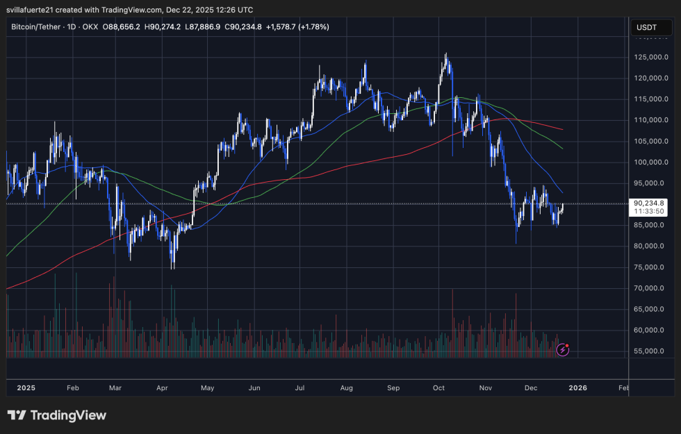 しかし、価格は現在、心理的に重要な8万8000ドルから9万ドルのゾーンのすぐ上で安定しており、これが最近の取引の反応水準となっている。この領域は以前の統合と密接に一致しており、買い手が主導権を取り戻そうとしている短期的なサポートクラスターを表しています。 🤝