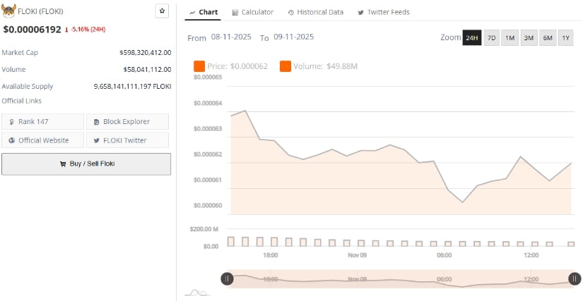 BraveNewCoin によると、私たちの最愛の Floki は現在、わずか 1 日で 0.00006192 ドル – 5.16% 下落しています。時価総額は 5 億 9,832 万ドル近くにあり、出来高は 5,804 万ドルです。これらの数字が私たちを常に警戒させていることは明らかです。循環供給ですか?約9兆6,500億トークンは混乱を活気づけるのに十分であり、世界的な人気コンテストで147位にランクされています。 🏆