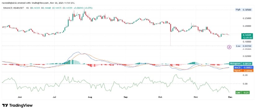 ああ、HBAR 日足チャートでは、暴風雨の後の泥池のように下降トレンドがはっきりしています。今年初めに0.30ドル近くでピークに達して以来、私たちの最愛の資産は、行儀の良い下降スパイラルのように、高値を切り下げ、安値を切り下げるという安定したダイエットを続けています。 10月下旬の鋭い芯?ああ、それは流動性の掃討だったのか、それとも強制的な売却の瞬間だったのか、それは誰にも分かりません。しかし、回復力のある魂のように、それはすぐに立ち直り、統合されました。まさに生存者だ!