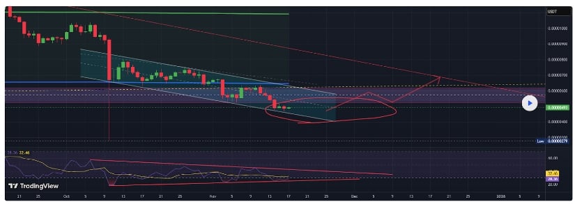 預言者の威厳と聖人の忍耐力を兼ね備えたデリバティブ・ストラテジストのジョーダン・キム氏は、チャートに身をかがめながら、時間と取引によって刻まれた狭い道、落ちるくさびについてつぶやく。 「これはラリーの起爆剤になるかもしれないが、まだ賭けてはいけない」と彼は言う。ターゲットは?わずか $0.00000520 ~ $0.00000550。サポート?わずか 0.00000455 ドルです。しかし、このミームコインの国では、綿密に練られた計画でさえ、下手に焼かれたパイのように崩れ去ることがよくあります。キム氏は、偽の吹き出物は干ばつのタンポポと同じくらいよくあることだと警告する。
