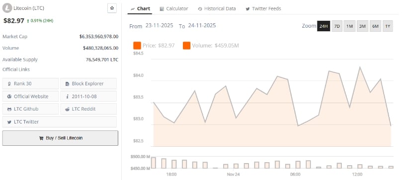 2011 年にあの謎の人物チャーリー リーによって作成されたライトコインは、暗号通貨の天体の中でその地位を主張しようとしています。ああ、「デジタルシルバー」って言うんですが、引き出しの中にある変色したスプーンのようなものですよね?トランザクションが速くなり、手数料が安くなるということは、それが仮想通貨の深淵の広大な暗闇の中で揺らめくろうそくの灯にすぎないと理解するまでは、十分に良いことのように思えます。常に信頼できるコインマーケットキャップによると、LTCは絶望と希望の無数のサイクルを経て、83ドルから85ドルの回復力を持っていると彼らは自慢しています。そのインフラは嵐の中でもまだ浮かぶボロボロの船のように安定しており、市場参加者は賢明か愚かかで、過去の傾向を振り返って将来を予測します。あるいは、未知の恐怖から身を隠すためかもしれません。