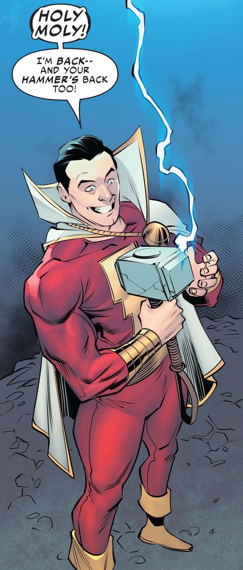 ビリーはもう一度「シャザム」と言い、ソーを連れ戻しますが、驚くべき変化がありました。ドン・ブレイクは杖を使ってソーに変身できなくなりました。代わりに、それができるのはビリー・バットソンです!ビリーはその杖を使って再びキャプテン・マーベルになり、キャプテン・マーベルがソーの力を使えるようになったことが判明したのです!