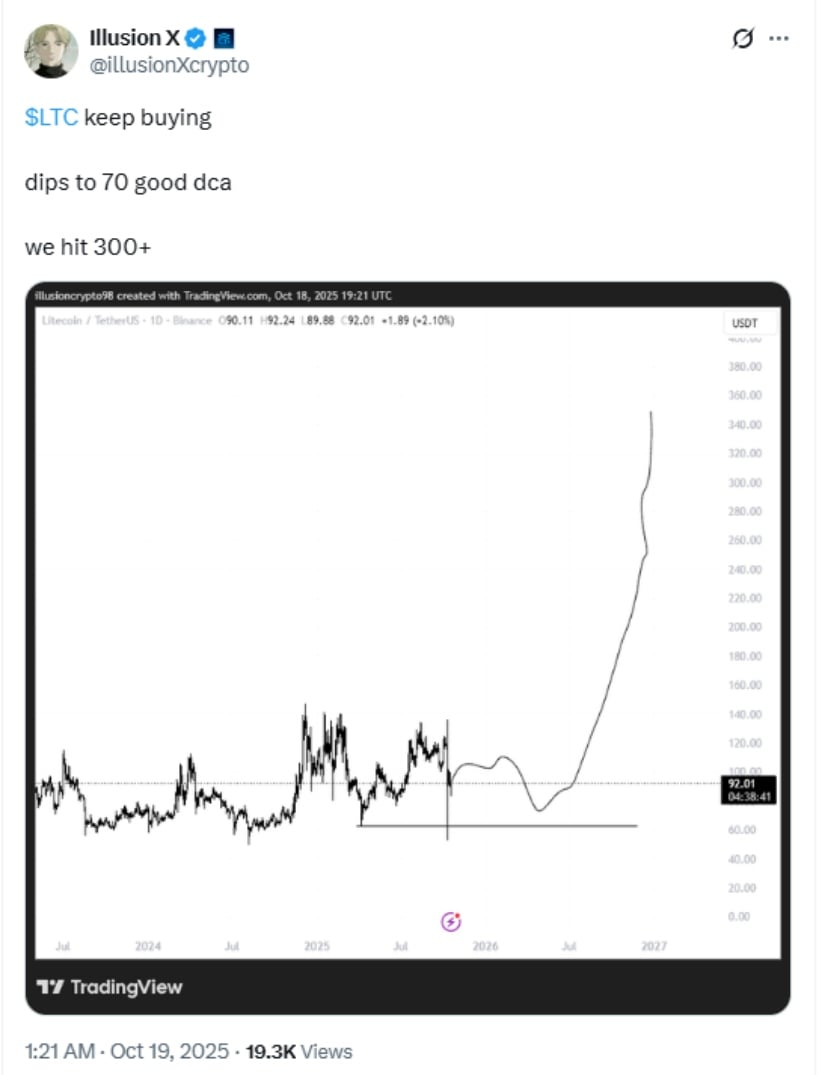 デジタル時代の預言者である @LitecoinToad は、「フェイクアウト? いや、これは壮大なオペラへの序曲だ!」と宣言します。月足チャートのトレンドラインは、かつては壁だったが、今では古くなったクッキーのように崩れ落ちている。 92ドルで、LTCは勢いに乗ってワルツを踊ります。一方、@illusionXcrypto は笑いながらこう言っています。「70 ドルに落ちますか? 月のブラック フライデーのようなドルコスト平均です!」 🛒