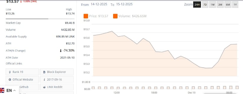 24 時間の LINK チャートは、短期的な弱さとその後のわずかな回復を示しており、価格は約 13.57 ドルで、この日は約 1% 下落しました。 1%の低下ほど「信頼」を表すものはないからです。 🚶♂️💨