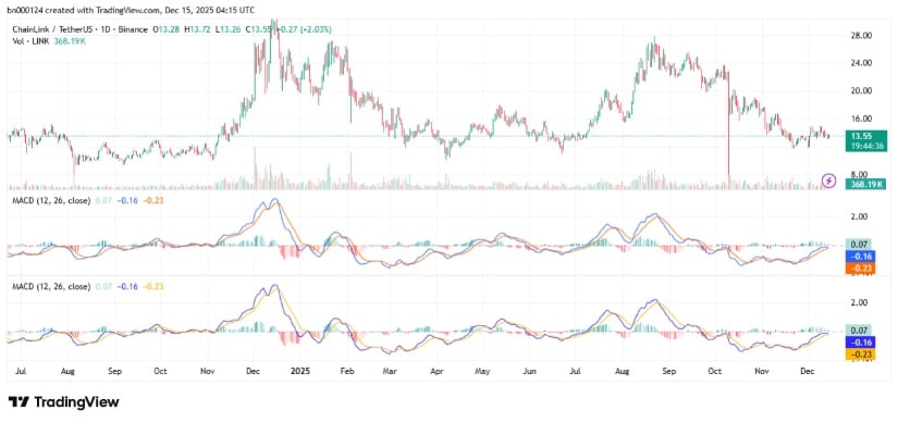 緩やかな回復の中、出来高は堅調に推移し、LINK価格は13.57ドル付近で安定