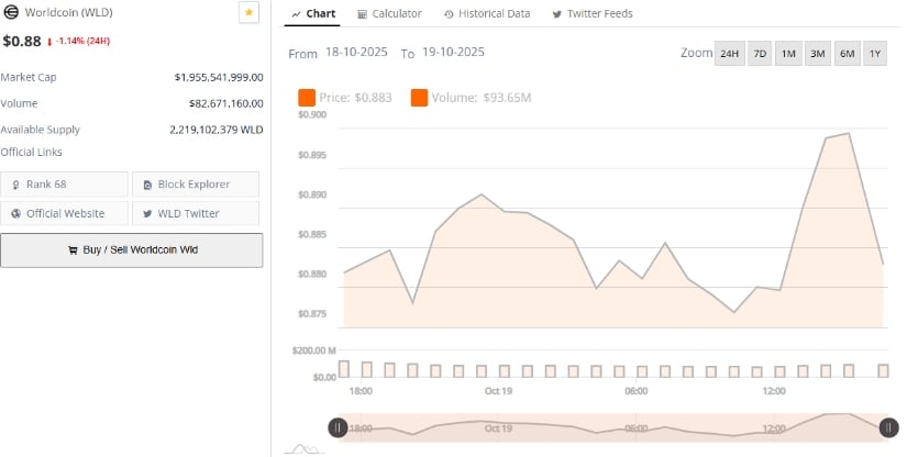 BraveNewCoinの最新データによると、現時点ではワールドコインは0.88ドルで取引されており、過去24時間でわずか1.14%下落した。時価総額は 19 億 5,000 万ドルと余裕があり、24 時間の取引高は 8,260 万ドルで、くしゃみする必要はありません。さえないパフォーマンスにもかかわらず、流動性は安定しており、以前にコインを悩ませた激しい売り圧力は後退したようです。最悪の事態は終わったのだろうか?時間が経てばわかるだろうが、市場は以前に比べてパニック状態が確実に薄れている。