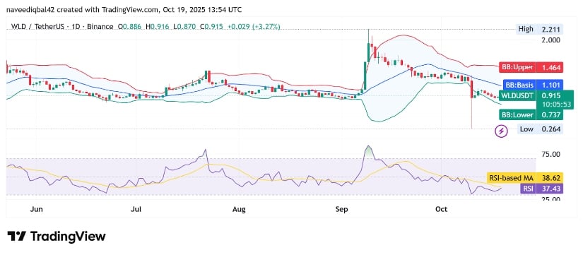 TradingViewによると、この記事の執筆時点でWLD/USDTは0.905ドル付近で推移している。ボリンジャーバンドは、感謝祭のディナー後のジーンズよりもきつく締め付けられています。上部バンドは 1.46 ドル付近、ベースラインは 1.10 ドル、下部バンドは 0.73 ドル付近で推移しています。これは私たちに何を教えてくれるのでしょうか?価格はレンジの底値付近で堅調となっており、これは潜在的な反発の準備ができていることを意味する可能性があるが、もちろん、買い手が再び昼寝をすることに決めなければ。