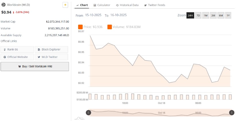 BraveNewCoinのデータによると、ワールドコインの価格はわずか0.94ドルで、過去24時間で3.61%下落し、時価総額は20億7000万ドル、24時間の出来高は1億8,339万ドルと猛烈な勢いだ。こうした小さな苦難にもかかわらず、トップ 70 の仮想通貨の生き物 (キャップ順で 66 位) にしがみついていて、まだ完全には死んでいないその魅力を証明しています。