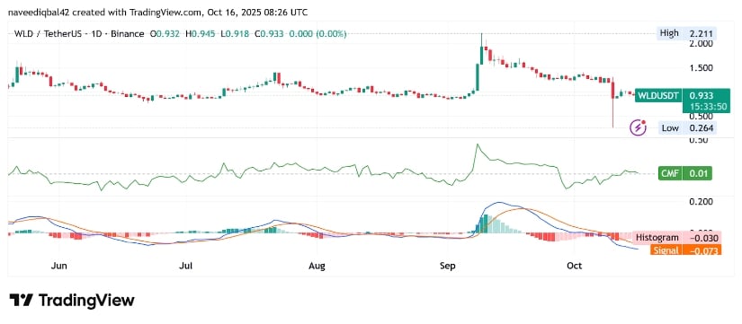 逆に、TradingViewに展開されたWLD/USDTの日足チャートは、劇的な下落の後に居心地の良い保ち合いを示しており、弱気の暴動がついに古い風船のように膨らみつつあることを示唆しています。チャイキン マネー フローは元気な +0.02 で、歓迎の財布が少しずつ開いていることを示しており、蓄積が再び忍び寄る可能性を示唆しています。測定値はゼロを超えていますか?ああ、それは投資家がウインクしたり小突いたりして、より低い価格に注目していることを意味するかもしれません。