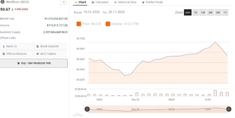 BraveNewCoin の報告によると、ワールドコインは過去 24 時間で 1.04% の小幅下落となり、0.67 ドル付近で推移しているとのことです。このわずかな落ち込みにもかかわらず、時価総額は依然として 15 億 7,000 万ドルという相当な水準にあり、23 億 3,000 万トークンの流通供給に支えられています。出来高は1億1,590万ドルに達しており、市場調整の波の中でも関心が続いていることを物語る心強い数字だ。 📉