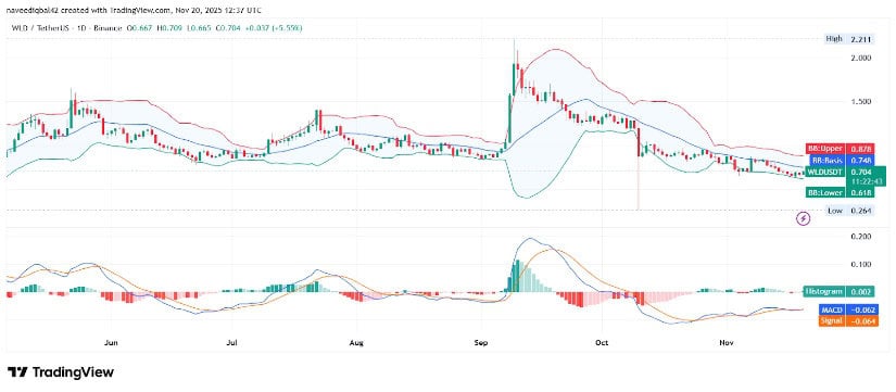 TradingViewの日足チャートでは、WLDは現在0.702ドルで取引されており、買い手が失地を取り戻そうとする中、日中に5.25%の上昇を示しています。価格は依然としてボリンジャーバンド基準の0.747ドルを下回っており、ワールドコインがより広範な下降トレンドの真っ只中にいることを示しています。しかし、最近の0.617ドルの下限からの上昇は、下押し圧力が弱まりつつあるのではないかというかすかな希望を与えている。ゆっくりと、しかし確実に。 🐢