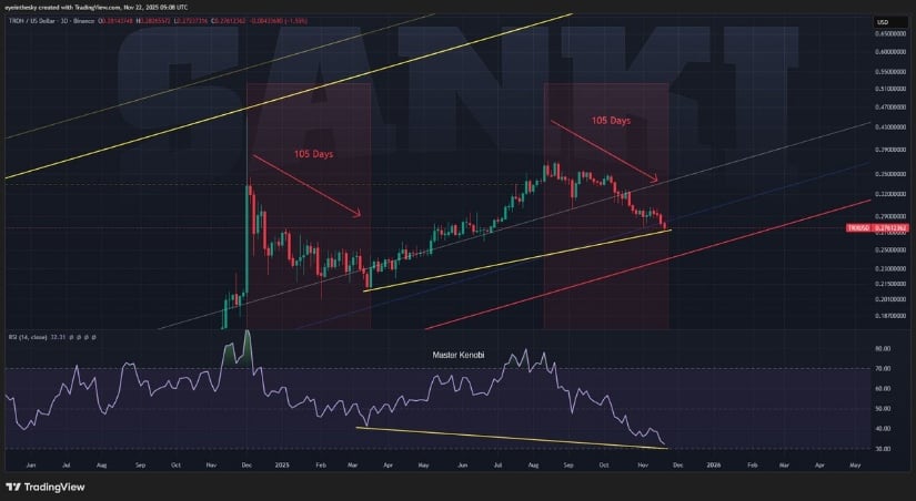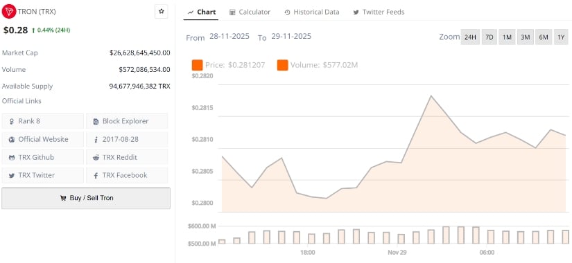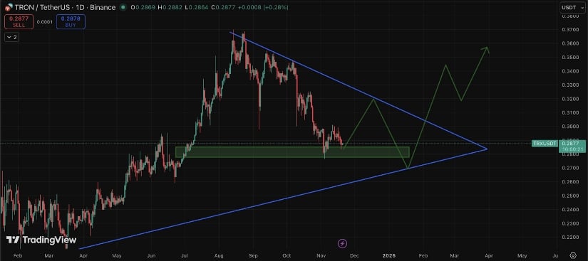 見よ! TRXは、仮想通貨の冬の冷たい灰の中に残った頑固な残り火で、夜明けの最後のタバコのように、0.28ドル付近で再び明滅する。 🚬 ノベンバーはそれを打ちのめし、嘲笑し、酔ったルーレットのように回転させた。それでもここにそれは立っており、勝ち誇っているわけではないが、少なくとも直立しており、希望と技術的なナンセンスの対称的な三角形にとぐろを巻いている。オンチェーンメトリクス?そうそう、豆売り場によれば、ネットワークは 1938 年のソ連の工場のようにざわめき、にぎやかで、騒がしく、おそらく便利ですらあります。しかし、親愛なる読者の皆さん、有用性は、この投機の大聖堂の家賃を払ったことはありません。 💸