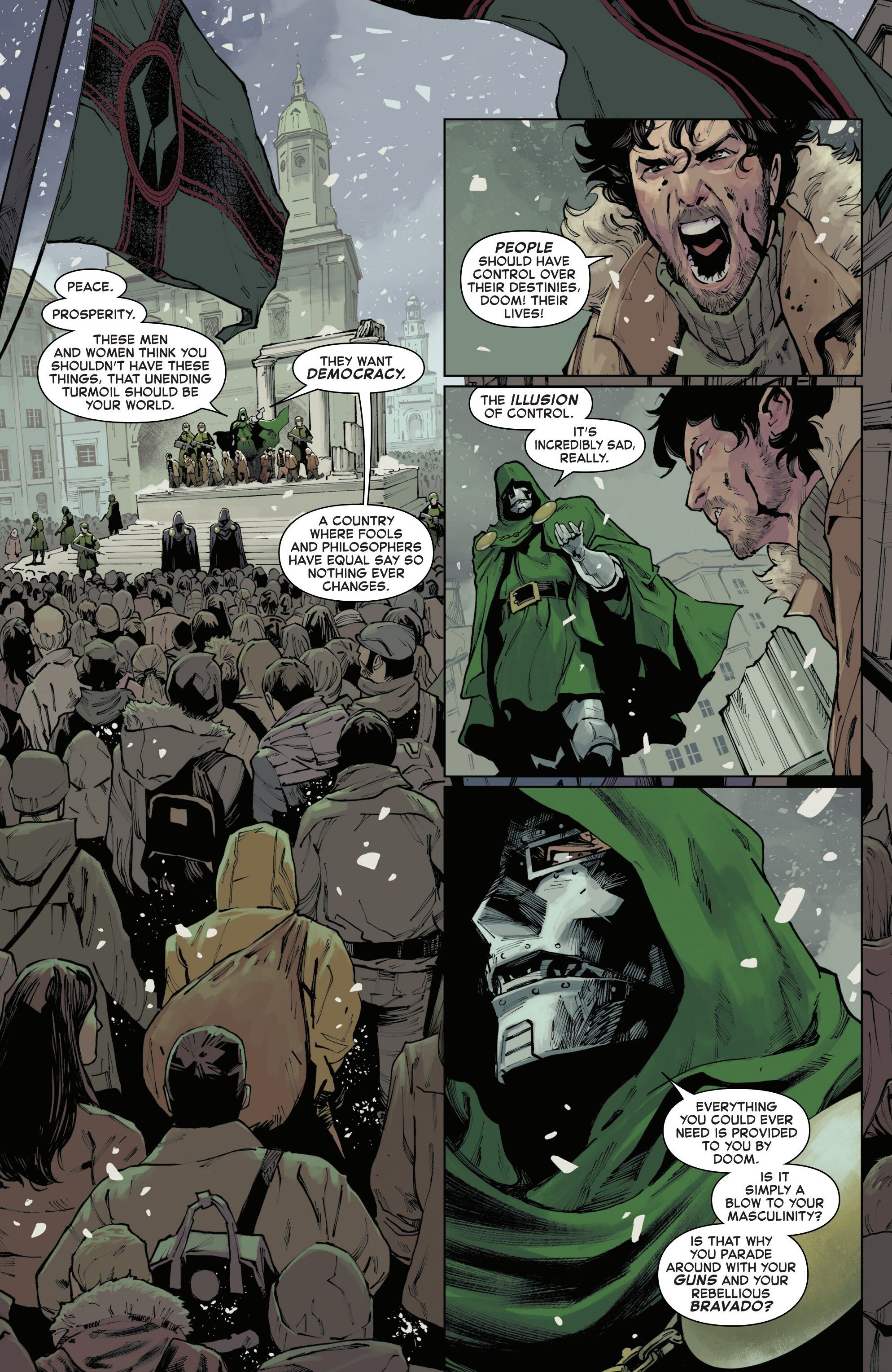 前号では、ドクター・ドゥームがキャプテン・アメリカと対峙し、第二次世界大戦中にキャップがかつてどれほど尊敬されていたか、そして彼がどれほど米国政府の道具になったかを指摘した。ドゥーム氏は、米国は密かに彼の乗っ取りを支援しており、大使館の人質を救出しようとしているのではなく、関与を隠蔽するために大使館の人質を排除しようとしていると主張している。驚くほど内省的な瞬間で、キャプテン・アメリカはドゥームの批判をほぼ受け入れ、国が変わってしまったかもしれないし、自分も国を去らなければならないかもしれないことを認めた。しかし、米国の行動に関係なく、ドゥームが悪役であることに変わりはなく、キャプテン・アメリカは常に悪と戦うだろうと彼は主張する。