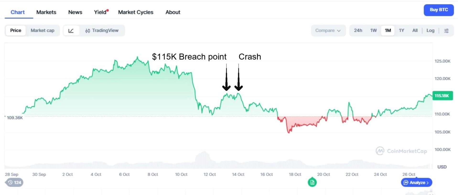 最近の仮想通貨暴落により、ビットコインは数時間以内に15%急落したが、(一時的に)115,891ドルまで上昇しただけで、17日には再び104,708ドルまで下落した。初めての集会でのデビュー選手の緊張と同じくらい不安定なパフォーマンス。 🙃