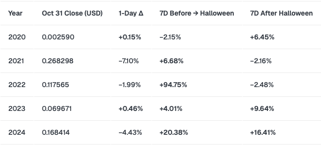 ああ、ハロウィーン – カボチャが笑い、魔女が高笑いし、仮想通貨市場が私たちをもてなすか騙すかを決定するあの魔法の時期です。 🍬✨ 目の肥えたトレーダーにとって、10 月下旬は幽霊というよりも、 (良い意味で) チャートがドーンと動くのが特徴です。歴史的に、11月の第1週は、タイミングの良いブロックチェーントランザクションのように、主要なトークンが墓場から復活する大暴落でした。 💀📈