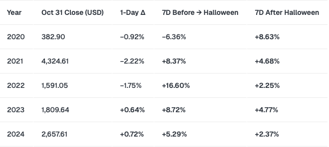 イーサリアムのハロウィンの利益は、混雑した部屋にいる幽霊のように微妙です。 2020 年から 2024 年の間、ハロウィーン後は平均 4.5% 上昇します。派手さはないが、いつも時間通りに現れる幽霊のような頼もしい存在。 ⏰