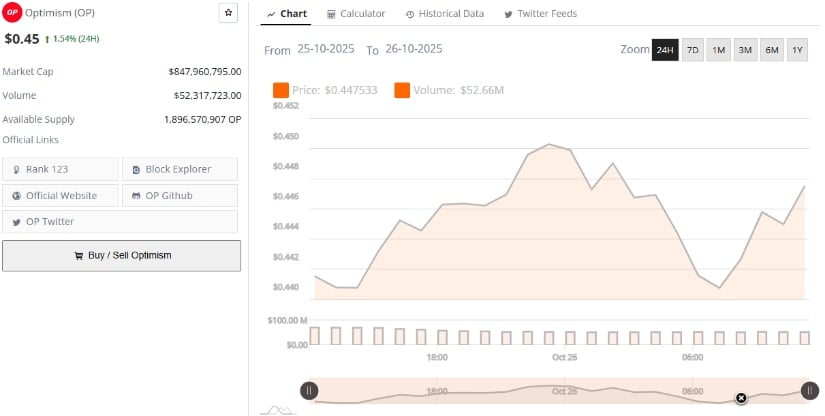 BraveNewCoin によると、オプティミズムは過去 24 時間で 1.54% 上昇し、0.45 ドルで取引されています。 🎉 紙吹雪、誰かいますか?時価総額は8億4,796万ドルで、1日の取引高は5,231万ドルです。ゼロがたくさんありますが、流通しているトークンは 18 億 9,000 万であることを忘れないでください。そう、トールキンの小説よりも長く感じられた下降傾向の後に失地を取り戻そうとしているのです。 📉 保有者は 0.44 ~ 0.45 ドルの範囲付近で慎重ながらも楽観視しているようです (しゃれです)。それらは蓄積されているのでしょうか、それともただ奇跡を願っているのでしょうか?時間が経てばわかるでしょう。 ⏳