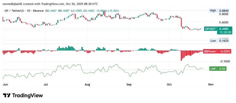 TradingViewで見ると、オプティミズムの日足チャートは0.88ドルから急落した後、0.4483ドル付近で安定しているように見えます。ボリンジャーバンドパワー(BBPower)の測定値は-0.0391で、これは基本的に弱気の勢いが私の新年の抱負よりも早く消えつつあることを意味します。 💤 売り圧力は弱まり、ボラティリティは縮小している。これは再蓄積段階の始まりでしょうか?買い手は0.55~0.60ドルに向けた回復を狙っているが、まだシャンパンを開けるのはやめておこう。 🍾
