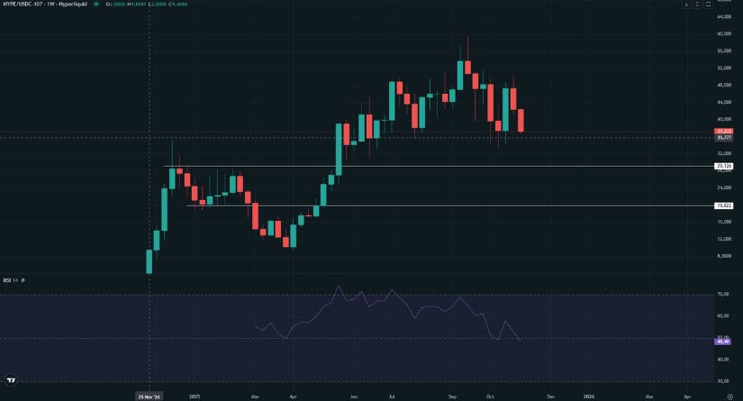 週足チャートは、25ドルから30ドルのゾーンへのウィックの再テストについて甘いことをささやいているが、そこでは流動性クラスターが同窓会の旧友のように待っている。 🥳 60 ドルからのオファーを複数回拒否された後、HYPE はカムバックを考える前に、その歴史的基盤を再訪する必要があるかもしれません。 20~30ドル付近のグレーゾーンは経済的には安全毛布に相当するが、回復の糸口でこれを突破すれば、それが今回の調整の最後の一撃となる可能性がある。それまでは、銀河系のパーティーでの誤った決定と同じくらい下振れリスクが蔓延しています。 🍸