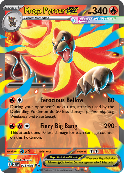 この新しいポケモンカードセットは 120 枚以上のカードを備えており、メガシンガルのアイデアに基づいており、メガ ジガルデがプロモーションの中心となっています。ブースター パックのアートワークはポケモン レジェンド: Z-A からインスピレーションを得ており、メガ ジガルデ、メガ クレファブル、メガ スターミー、ニャースが描かれています。