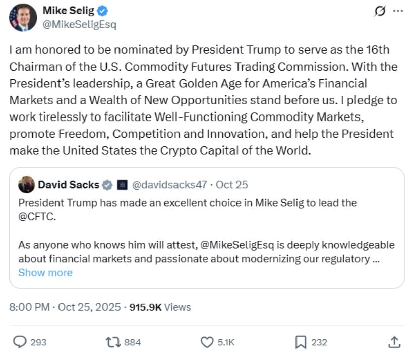 セリグ氏は、光を見た男のような熱意で、あるいはおそらく暗号通貨ウォレットの輝きだけを見て、X(以前はTwitter、現在は半真実とミームのデジタル汚水池)での指名を確認した。彼は、アメリカを「世界の仮想通貨首都」にするために、市場のシーシュポスのように果てしなく苦労することを誓う。ああ、壮大な甘美な妄想よ! 🌍💰